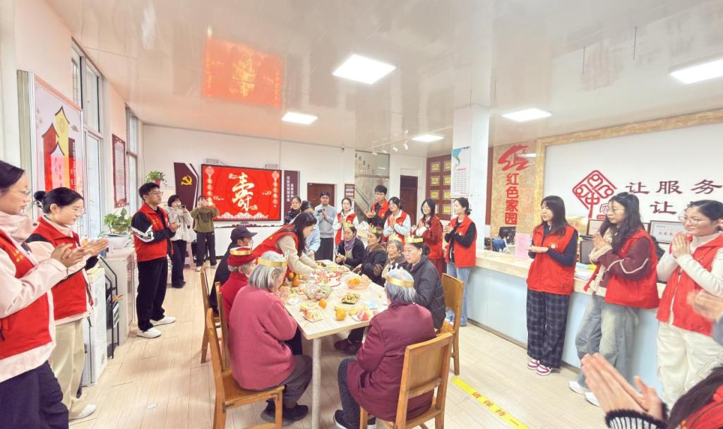 时间:2025-11-26 16:36 来源: 作者: 阅读: 次悠悠祝福声,浓浓敬老情。为传承中华民族尊老敬老的传统美德,传递社会关爱,弘扬志愿服务精神,11月25日下午,信阳师范大学法学与社会学学院研究生党支部携手华森社区,为社区老人举办了集体生日会。学院教师孔令媛和社会工作、法学专业志愿者共赴这场暖心之约。