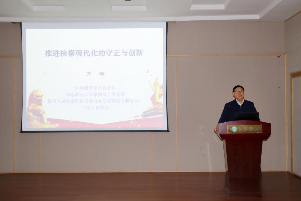 时间:2025-09-28 08:59 来源: 作者: 阅读: 次9月27日下午,最高人民检察院检察委员会原副部级专职委员、二级大检察官、中国犯罪学学会会长万春,应邀做客我校贤林讲坛,作了题为“推进检察现代化的守正与创新”的学术报告。报告会由我院党委书记尚红林主持,学院部分教师及本科生共同聆听了讲座。
