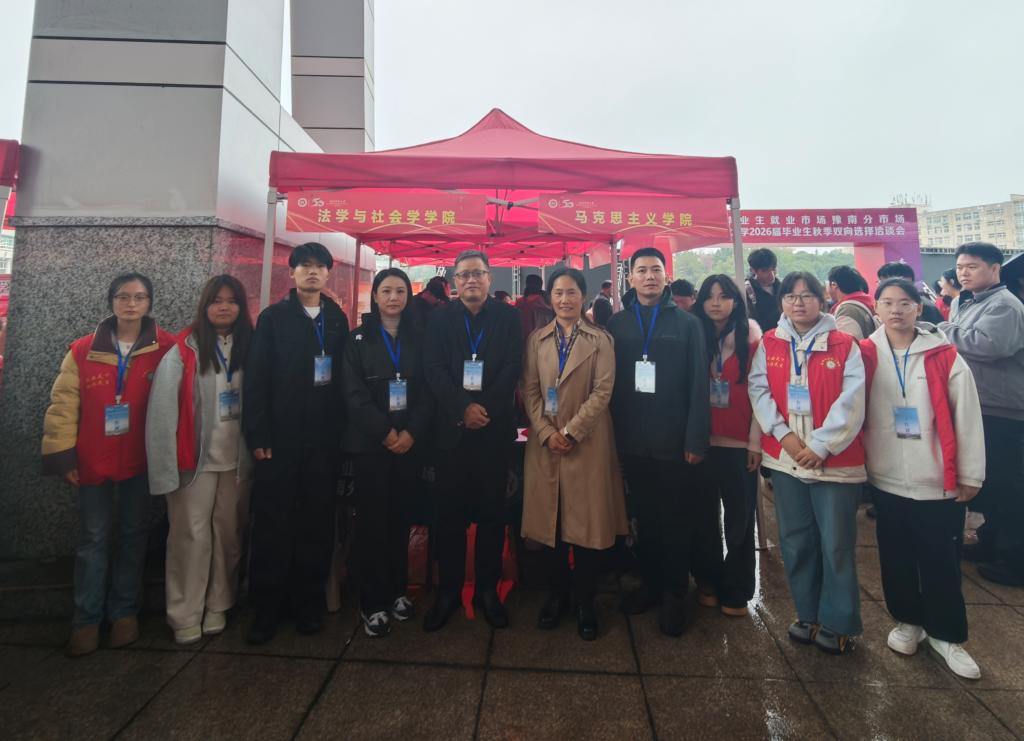 11月7日,信阳师范大学2026届毕业生秋季双选会在体育馆成功举办。法学与社会学学院积极组织毕业生参与此次活动,学院党委书记尚红林、院长古瑞华、党委副书记刘雨亭带领辅导员费泽丹亲临现场指导,为毕业生提供全方位就业支持。
