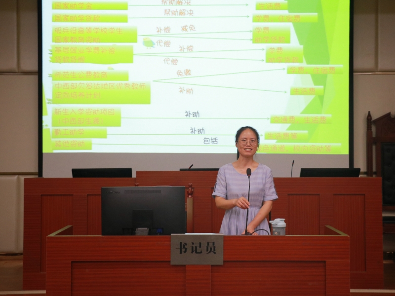 活动中,王艳丽向2025级新生系统介绍了国家及学校各类资助政策,引导学生常怀感恩之心、践行自强之志。院团委学生会权益保障部苏梦珂围绕国家奖学金、国家励志奖学金、国家助学金和国家助学贷款等项目,详细解读申请条件、认定标准、覆盖范围、时间节点、申请流程及评议制度,助力家庭经济困难学生顺利申请资助、安心就学。